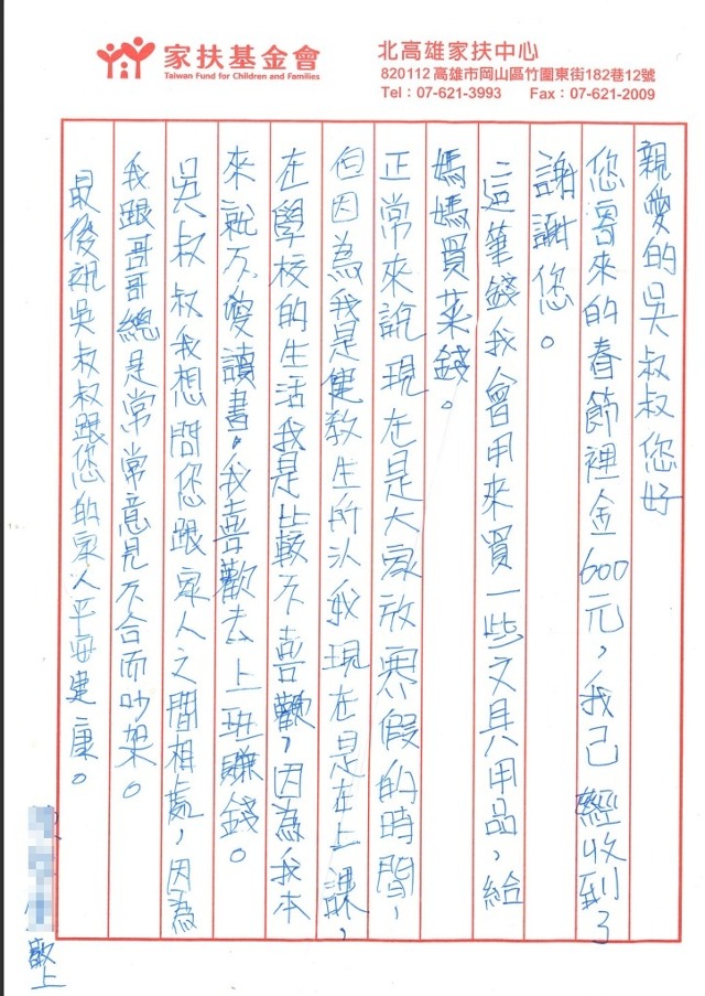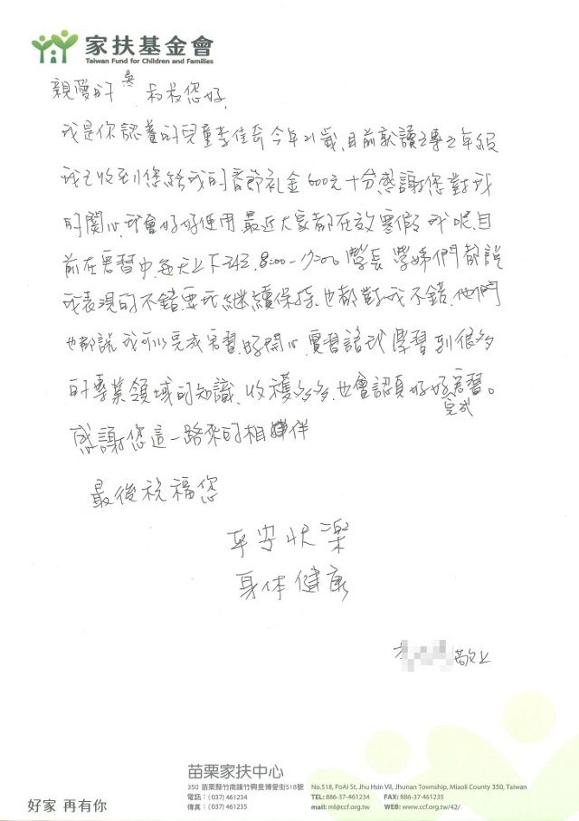 Dr. George Wood, President of TBS Group Corp., has always been committed to charitable activities. He has been a long-time supporter of the Taiwan Fund For Children and Families, providing regular donations and participating in emergency relief efforts to assist families and children in need. During this time, we also regularly receive letters of gratitude from children and parents, expressing their sincerest thanks to this anonymous benefactor. It is hoped that this compassion will help more impoverished families in need while also providing encouragement to these children, enabling them to become successful individuals in the future.