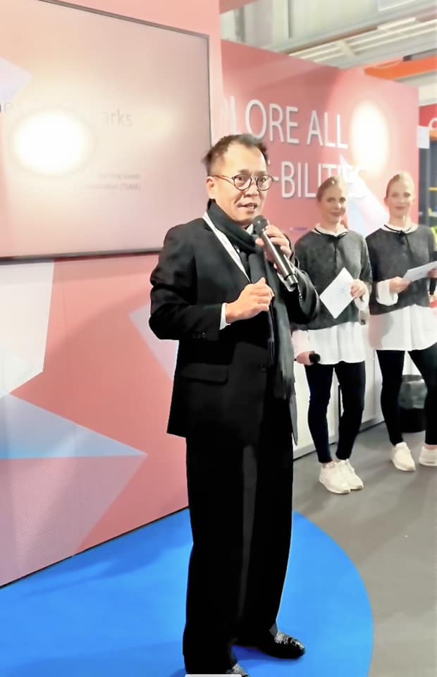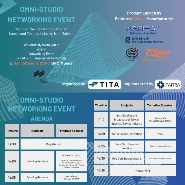 In the second year after the pandemic, ISPO Munich has gradually returned to its previous scale. This time, the Taiwan External Trade Development Council (Taitra) also hosted the Omni-Studio Networking Event during the exhibition. Dr. George Wood was invited to deliver opening remarks to introduce Taiwan's sports goods industry to foreign vendors and participants. Seizing this opportunity, Dr. George Wood also introduced the latest AROFLY i-series to the attendees.