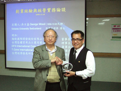 National Taiwan University is the top University in Taiwan and its professor invited Dr. George Wood to share his experience of enterprise and international trade to over 30 students who are in the MBA program. During the two hours lecture, students were utterly absorbed in his experience sharing. After the lecture, Dr. George Wood recieved a medal from the students and professor as a token of their appreciation.