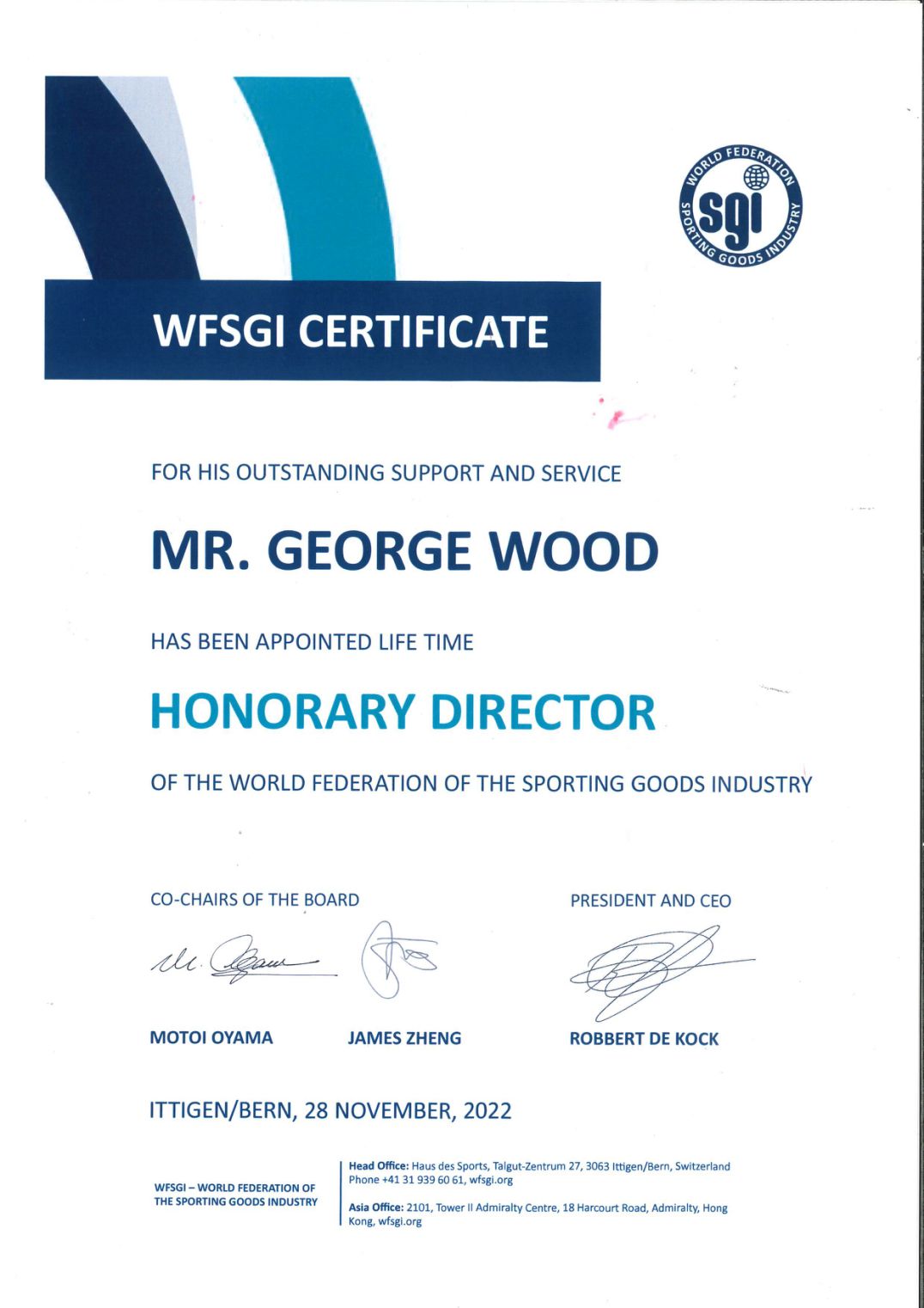 On Nov. 28th, 2022, Mr. George Wood, the Board Director of World Federation of the Sporting Goods Industry, attended the 2nd annual board meeting in Munich, Germany. At the WFSGI official dinner, Mr. Wood was honored to receive the award of 《Life Time Honorary Director of WFSGI》. It has been more than two decades for being a board director at WFSGI. During this period of time, Mr. Wood not only has voiced for Taiwan’s sporting goods industry on the international stage, but also have known many board directors from many countries and built solid and valuable friendship. He had received continuous support and assistance from various aspects.