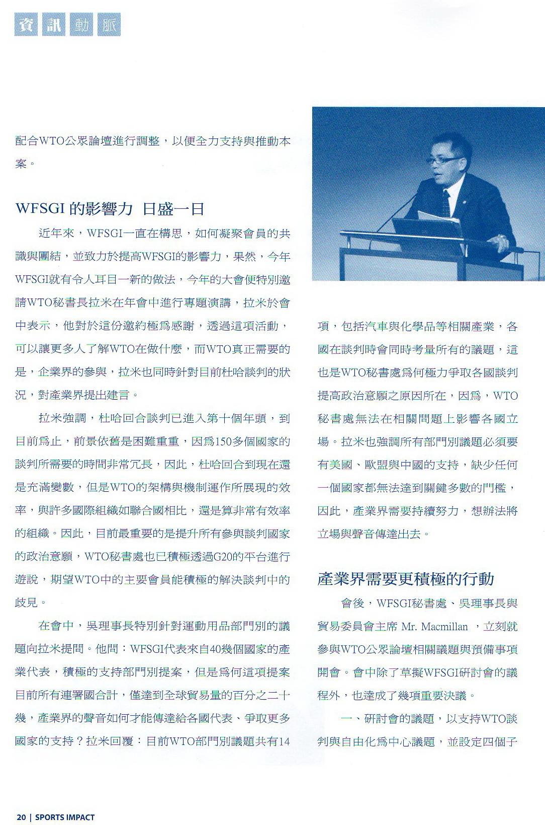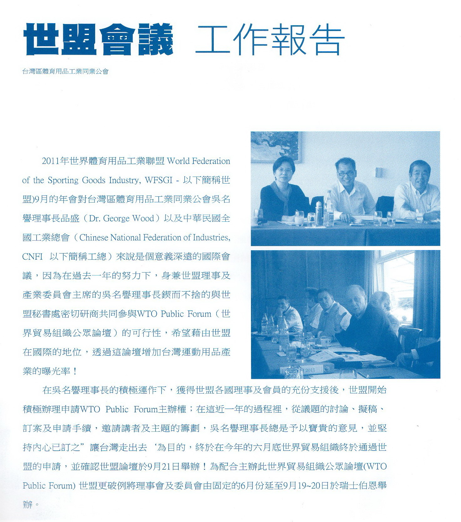Taiwan sporting goods industry has been playing an important and active role in the global sporting industry. We will continuously contribute ourselves to this industry. We sincerely hope all of you can give all your support and encouragement to come to TaiSPO and WFSGI Manufacturers Forum.