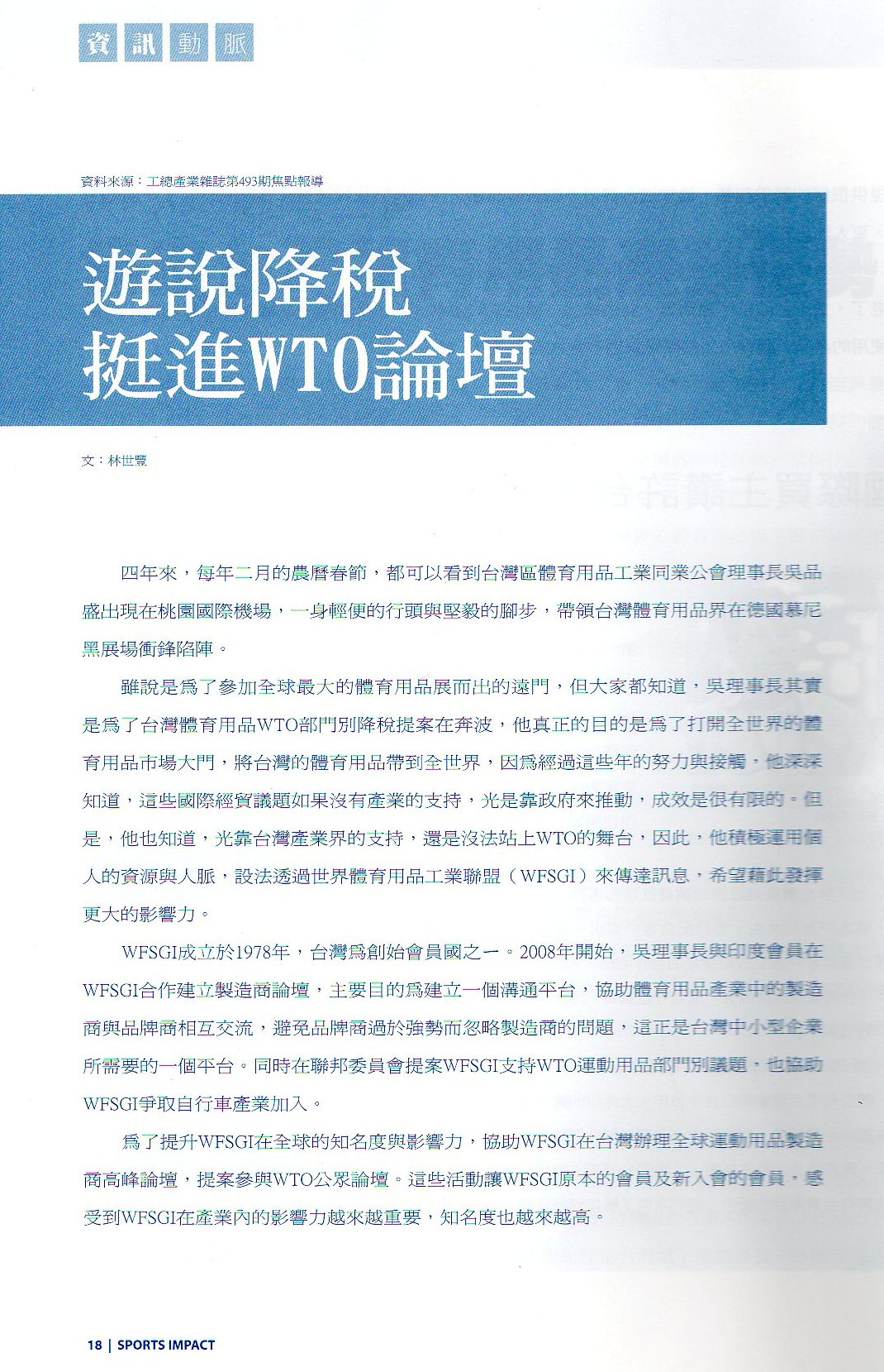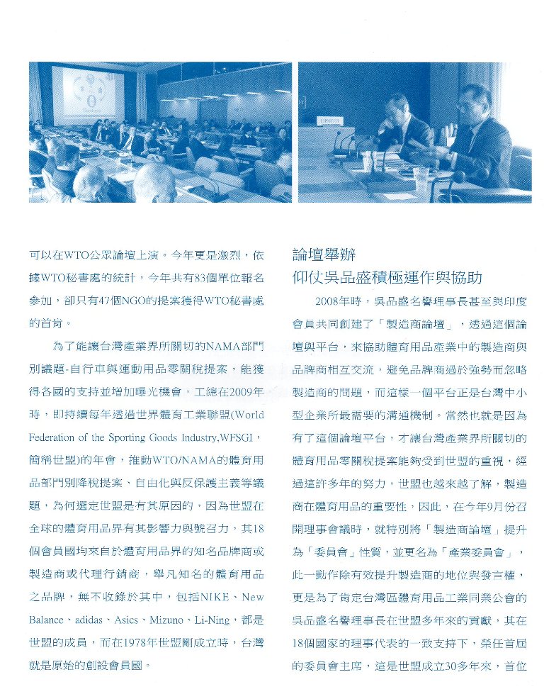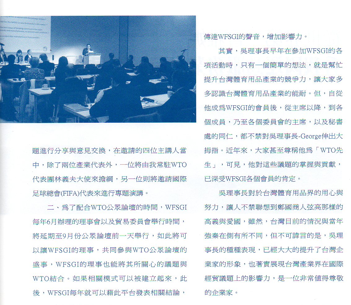 TaiSPO (Taipei International Sporting Goods Show), a worldly-known sports show, is ranked among top sporting goods shows in Asia. Over the past 8 years, I have made the utmost effort to work with our governmental exhibition department to enhance its international publicity. Gladly, the numbers of exhibitors and visitors have broken all the records in its 38 year history this year.