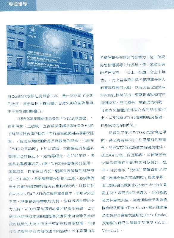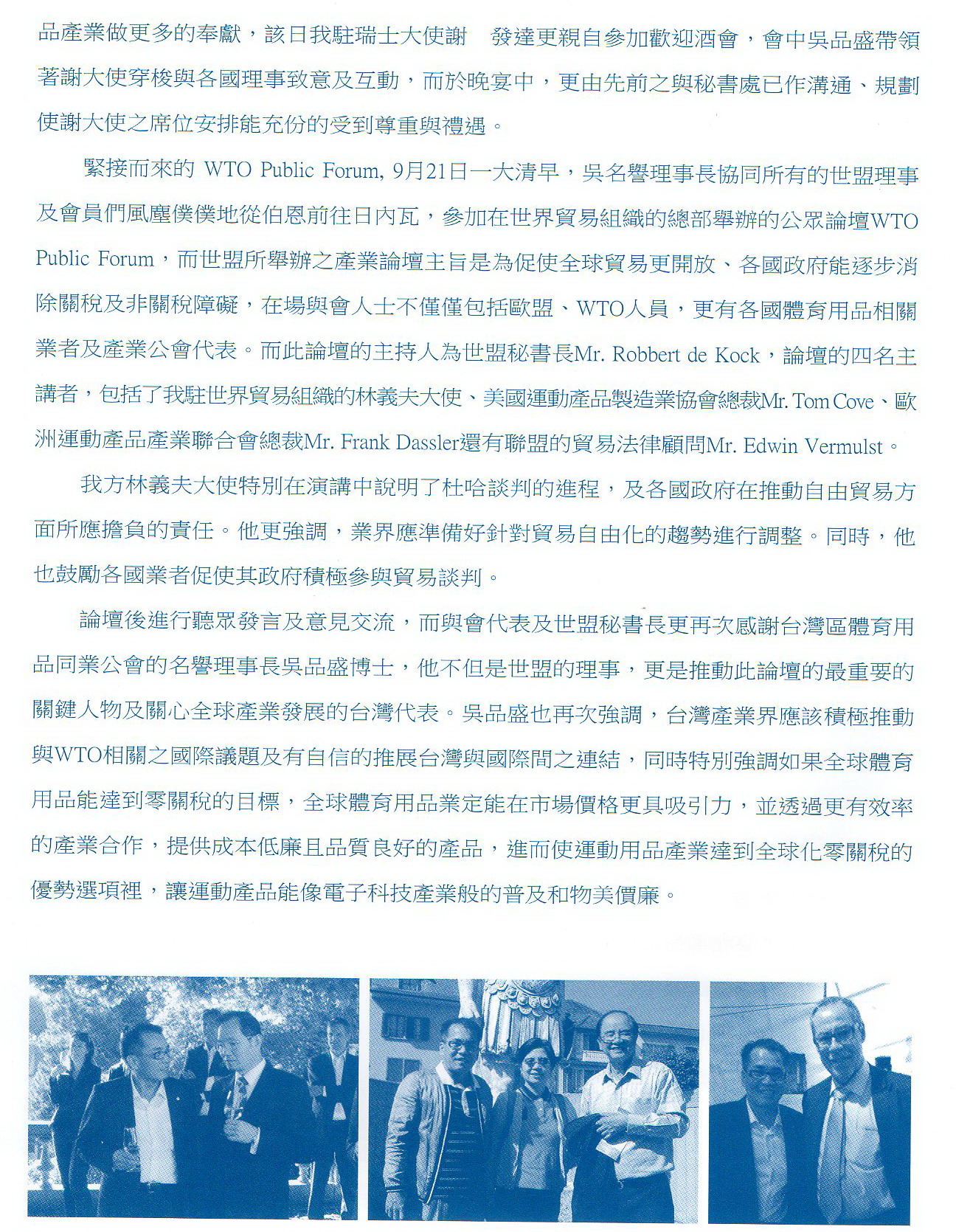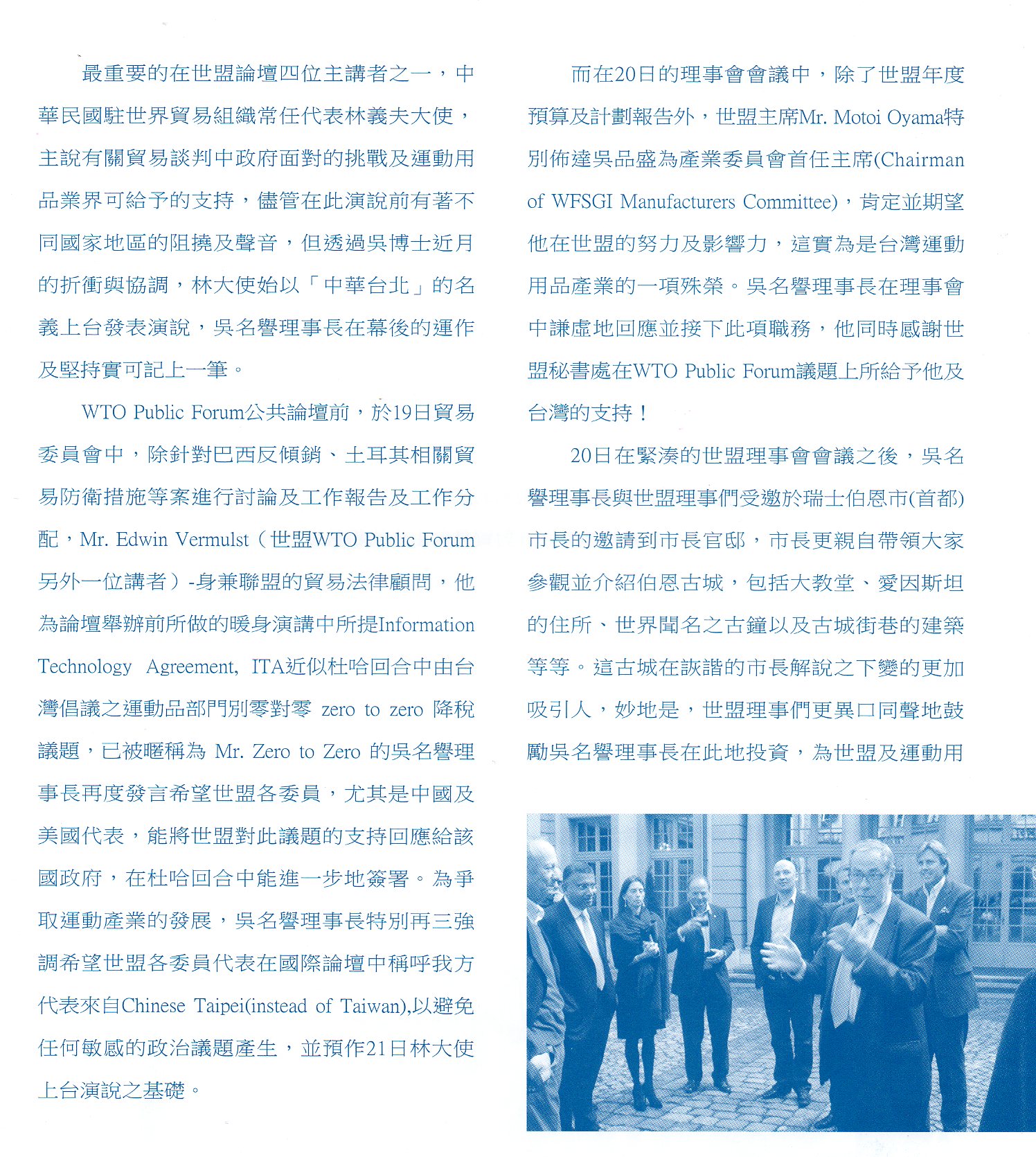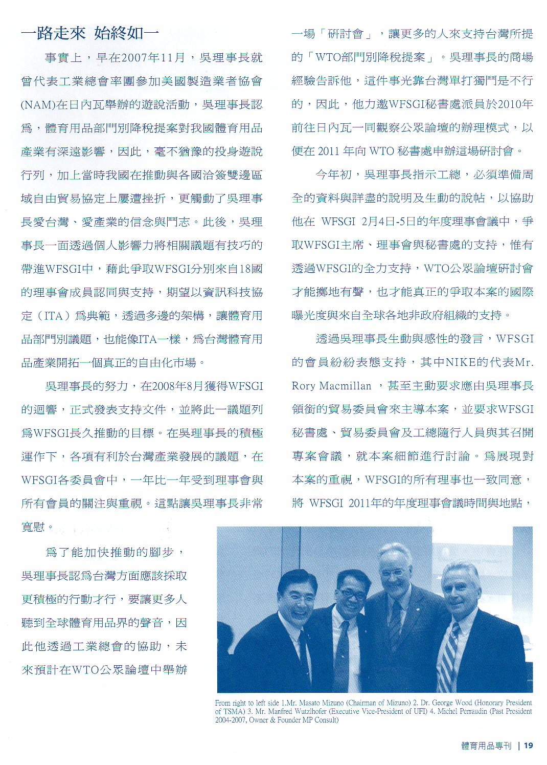 TaiSPO (Taipei International Sporting Goods Show), a worldly-known sports show, is ranked among top sporting goods shows in Asia. Over the past 8 years, I have made the utmost effort to work with our governmental exhibition department to enhance its international publicity. Gladly, the numbers of exhibitors and visitors have broken all the records in its 38 year history this year.